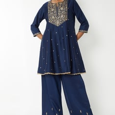 Step out in graceful elegance with this embroidered A-line kurta set. The kurta features a notch neck and 3/4th sleeves, paired with palazzos with an elasticated waist and a matching dupatta for a complete, polished look.