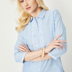 Enhance your casual wear collection with this exquisite kurta, adorned with an embroidered design. Featuring a spread collar, three-quarter sleeves, and pockets, it exudes both style and practicality.
