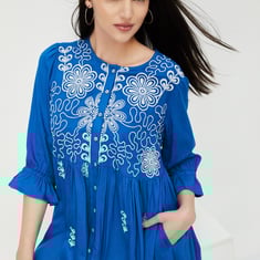 Elevate your fashion game with this beautiful boho dress, expressing your distinctive style. Designed with a round neck, full-length button placket, embroidered yoke, and puffed sleeves, it seamlessly blends comfort with a touch of glamour. The midi-length silhouette makes it versatile for various occasions