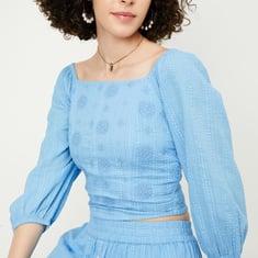 Slay your warm-weather style with this cropped top. It is updated with a seersucker pattern and tonal embroidery at the bodice. This cropped profile has a square neckline, peasant sleeves, and a smocked back panel.
