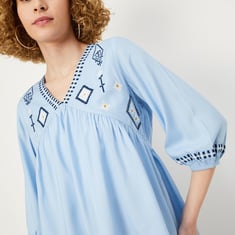 Revamp your casual wardrobe with this stylish top that features a V-neckline and three-quarter sleeves with elastic. The embroidery at the yoke enhances the style.