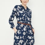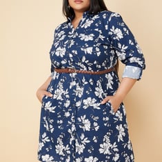 Step into spring with this floral printed tunic, featuring a collared neckline, full sleeves with buttoned cuffs, a belted waist, and front pockets for a blend of style and functionality.