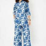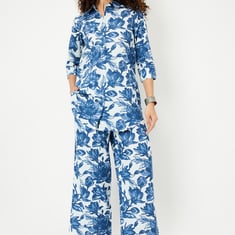 Floral, fresh, and fabulously comfortable, this co-ord set is your go-to for effortless style. It features a chic short tunic with a spread collar and three-quarter sleeves, offering a relaxed yet polished look. Paired with matching palazzos this set designed for comfort features an elasticated waist and side pockets for added practicality.