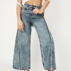 Women Frayed Trim Wide Leg Jeans