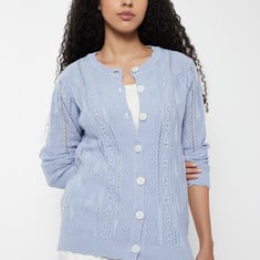 This jacquard cardigan is designed with a classic round neckline and full sleeves. It features a button-down front for easy wear. Delicate pearl embellishments elevate its refined charm.