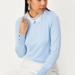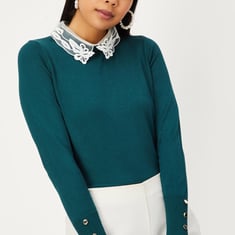 This elegant jumper will keep you warm and fashionable throughout winter. It has a lace collar, full sleeves, a ribbed hem and button closure. Style this jumper with a pair of jeans and lace-up shoes for a cosy look.