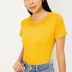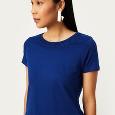 Add some style to your everyday wardrobe with this trendy top. Featuring a lace at the neck, it also has a round neck, half sleeves, and an elasticated hem. Pair it with jeans and sneakers to create a standout look.