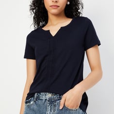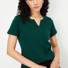 Spruce up your casual look with this chic T-shirt. Designed with lace detailing on the front, a notched neckline, and half sleeves, it effortlessly adds a touch of elegance to your everyday style.