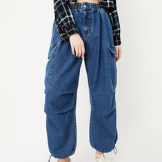Revamp your denim collection with this pair of jeans, offering both style and comfort. Featuring an elasticated waist with button closure, a parachute fit, and drawcord at the hem, they ensure a perfect fit. Complete with cargo pockets and a full-length construction, these jeans are the epitome of urban chic.