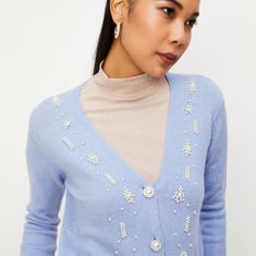 Dress for the season in style with this cardigan that is highlighted with pearl embellishments all over. It is designed with a V-neckline, full sleeves, embellished button closure, and ribbed trim. Layer this cardigan over a tee and team it up with trousers and boots.