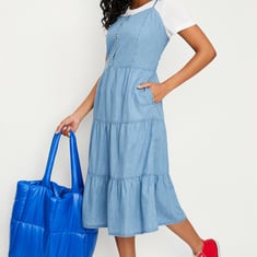 Transition through the seasons in this denim dress. It is styled with spaghetti straps, a front button placket, a smocked back, waist pockets, and a tiered profile. This dress comes with a plain tee to complete the look. Style this set with high-top sneakers for an effortlessly casual style.