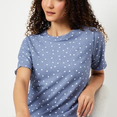 Look cool and casual in this T-shirt. It is styled with a round neck, half sleeves, and a straight hem. All-over polka dot prints lend a playful flair.