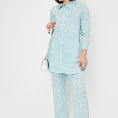 Elevate your style with this printed co-ords set. The tunic features a spread collar, full sleeves, button placket, and a flattering curved hem, while the matching trousers with an elasticated waist provide comfort and ease. This set is perfect for a chic, coordinated look that’s both elegant and comfortable.