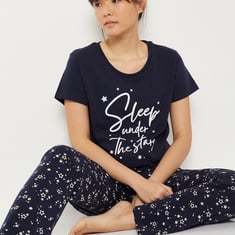 Stay cosy and stylish in this printed pyjamas set, featuring a round-neck, half-sleeve t-shirt paired with pyjamas designed with an elasticated waist, drawstring, and handy pockets. Perfect for lounging or bedtime comfort.