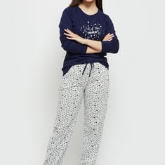Indulge in the most comfortable fashion trends with this pyjamas set. It has a printed t-shirt with a round neck and full sleeves. It is teamed up with a pair of printed pyjamas that has a drawstring closure and full-length construction.