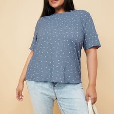 Let your style shine in this top. It is designed with a round neck, half sleeves, and a straight hem. The polka-dot prints add a classic touch. Model Size :