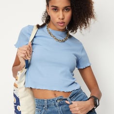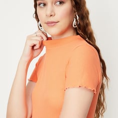 Refresh your casual wardrobe with this rib knit top. It features a mock neck, short sleeves, a crop profile, and a lettuce-edge trim. Pair this top with jeans and sneakers for a casual day look.