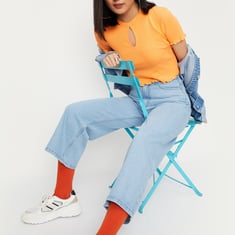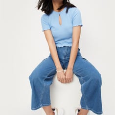 Nail the casual chic styling with this crop top that is highlighted with a ribbed pattern. it features a round neck with a cut-out, short sleeves, and lettuce trim. Complete the look by teaming up this top with jeans and sneakers.