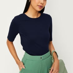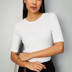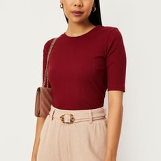 This T-shirt features a ribbed pattern, a round neck, and half sleeves for added style. Pair it up with trousers and earrings to complete your look.