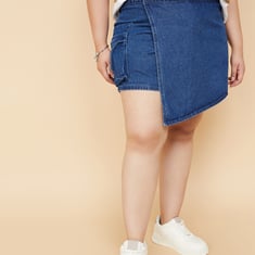 Add a touch of casual chic with these rinsed denim skorts. Featuring a button closure and a side pocket for practicality, the front overlay creates a skirt-like appearance while offering the comfort and freedom of shorts. Perfect for laid-back days with style. Model Size :