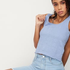 Gear up for the warm summer days in style. This tank top is highlighted with a smocked pattern, scoop neckline, a sleeveless construction, and a crop profile. Team up this top with a pair of denim shorts and sneakers for a casual chic look.