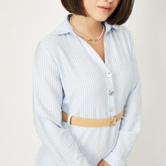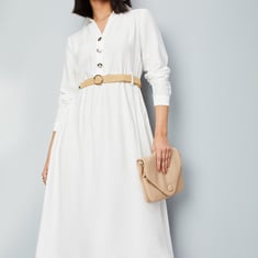 Elevate your wardrobe with this A-line midi belted dress! Featuring a collared neckline, full cuffed sleeves, and a half-button placket, it combines classic style with a modern twist for the perfect fit.