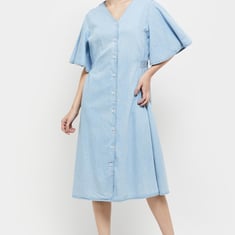 Fronted with a solid surface, this denim dress will make you look chic and stylish at the same time. The button-down silhouette, bell sleeves, and v-neck style make it a perfect pick for casual outdoor settings.