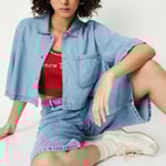 This boxy fit crop denim shirt is a perfect blend of casual and chic, featuring a solid design with a spread collar and button placket. The half sleeves offer a relaxed, breezy fit. Model Size :