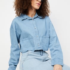 Women Solid Crop Denim Shirt