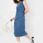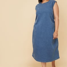 Flaunt your style in this bodycon denim midi dress offers a sleek, figure-hugging fit that flatters your shape with slit at the back. Featuring a classic round neck and sleeveless design, it combines casual style with a chic, modern look. Model Size :