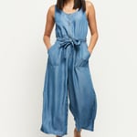 Detailed with a solid surface, this jumpsuit features a round neck, fabric belt and a sleeveless construction.