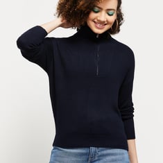 Upgrade your wardrobe this winter season with this sweater designed with a solid surface, high neckline, zip closure, and full sleeves.