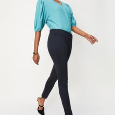 Tailored in a solid design, this pair of treggings is complemented by an elastic waistline. An ideal pick for a casual wardrobe, this pair scores well with a printed tee and sneakers.