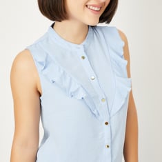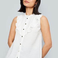 Elevate your style with this solid shirt-style top! Featuring a sleeveless design, a band collar, and ruffles on the front, it adds a chic and feminine touch to your wardrobe. The buttoned detail gives it a polished, refined finish.