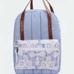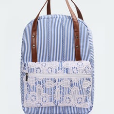 This striped crochet embroidered backpack features intricate embroidery, adjustable straps, and a zip closure for secure storage. The front pocket adds extra convenience for easy access to small essentials.