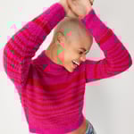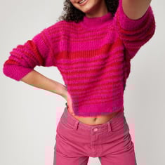 Beat the winter blues in this sweater which is crafted in a cropped length with a striped pattern. It is styled with a mock neckline, drop shoulders, long sleeves, and ribbed trim.