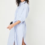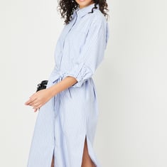 Upgrade your wardrobe with this chic shirt dress, featuring timeless stripes, a spread collar, and a button placket. The tie-up belt accentuates the waist, while the full sleeves with roll-up tabs and a patch pocket add both practicality and style. The side-slit curved hem enhances its modern silhouette, blending classic elegance with contemporary flair effortlessly.