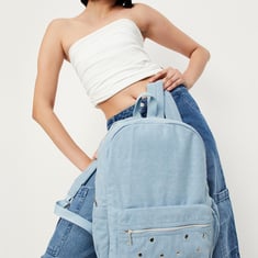 Elevate your style with this super spacious backpack made of denim that offers style and functionality. It has one outer zip pocket, a main compartment with a zip top for spacious storage, and side pockets. The ergonomic back straps, two inner pockets, and a top handle complete the look. Its spacious design ensures that your belongings stay protected during long hours of travel. The studded detailing on the front pocket gives an elevated, edgy touch.