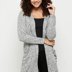 Layer up your looks with this long shrug featuring a hooded neckline, shawl collar, long sleeves, and waist pockets.
