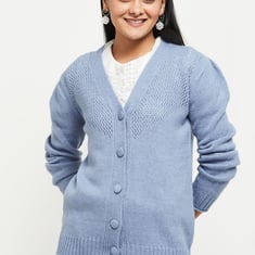 Layer your look with this cardigan featuring a V-neckline, full sleeves, open weave panels, and ribbed trim.