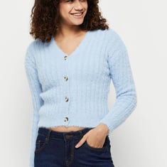 Updated with a textured surface, this knit cardigan features a V-neckline, drop shoulders, long sleeves, and ribbed trim.