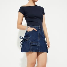 Add a touch of edge to your wardrobe with this tie-up detail denim mini skirt. Featuring cargo pockets for a practical yet stylish look, it has a button closure for a secure fit. The tie-up detail adds a trendy twist to the classic denim design.