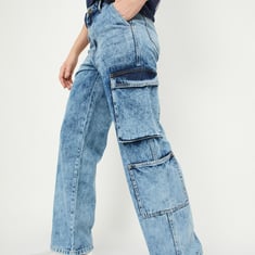 Conquer the day in style with this pair of jeans. The faded design gives a charming look. This pair features a belt loop waist, patch pockets, and cargo pockets. The wide leg profile offers roomy comfort. The high-rise profile offers a flattering look.