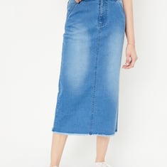 Enhance your casual wardrobe with this midi denim skirt with washed surface, pockets, a slit at the back and a belt loop waist. Club it with a pair of chunky loafers and a crop top to look extra sassy.