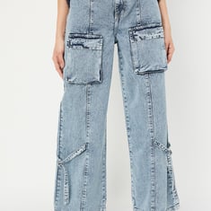 Step into effortless style with these trendy wide-leg cargo jeans. Crafted from washed denim, they offer a perfect fit that combines comfort with a laid-back vibe. The dual front pockets and back patch pockets add practicality, while the stylish tie-up details enhance the contemporary design