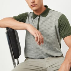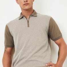 This T-shirt is the perfect balance of style and comfort. It has a polo collar, half sleeves, and a geometric knit panel. It has a zip closure and side slits for a striking look.
