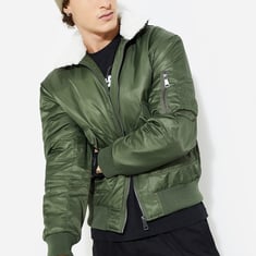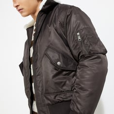 Stay warm and stylish with this bomber jacket. Multiple pockets ensure practicality. It is designed with a sleek, classic bomber fit. The sherpa collar and ribbed trim add a cosy touch.