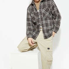 Chill vibes and sharp looks make this overshirt a must-have this season. Its checked pattern lends a classic look. The spread collar adds a sharp touch, while the double patch pockets keep things functional and fresh. Full sleeves and a curved hem make it a versatile piece. The oversized fit ensures all-day comfort.