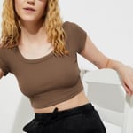Keep it chic and casual with this ribbed crop top, featuring a flattering scoop neck and half sleeves for a sleek, fitted look. The ribbed texture adds a stylish edge to this everyday essential.