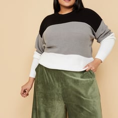 Keep the winter chills at bay with this colourblocked sweater, featuring a round neck, full sleeves, and a ribbed hem for added warmth and style.
